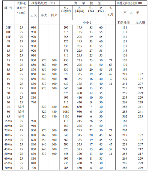 注:1、表中力學性能所給數據(除沖擊韌性Ak)系指用熱處理(正火)毛坯制成的試樣測得的,并僅適用于截面尺寸不大于80mm的鋼材,對于大于80mm的鋼材,允許其伸長率δ5、斷面收縮率Ψ較表中數據分別降低2個單位及5個單位。
